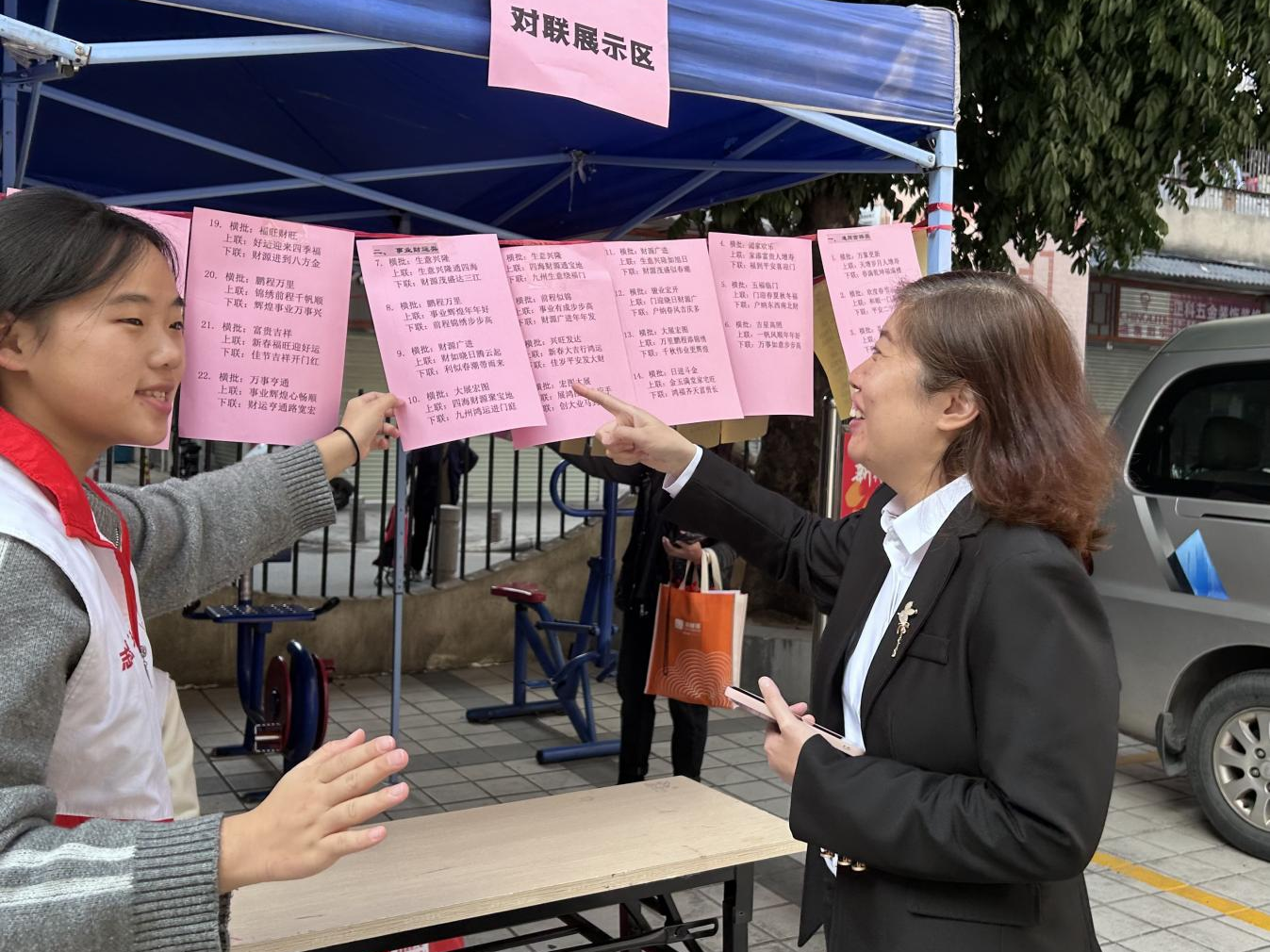 政协委员与居民们纷纷驻足欣赏,不时为书法家们精湛的技艺点赞喝彩。大家一边挑选着心仪的春联,一边与书法家交流书法心得,互相道贺新春。现场欢声笑语不断,浓浓的年味在笔墨间流淌,在邻里间传递。红色喜庆的春联不仅为即将到来的春节增添了喜庆色彩,更让大家感受到了街道和政协委员的温暖关怀。