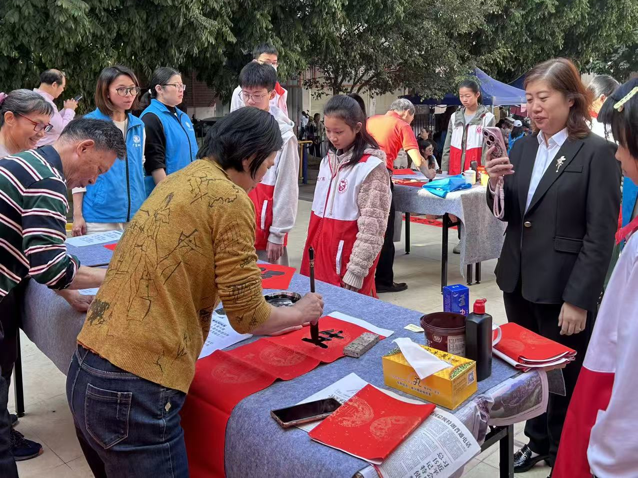 活动现场早已布置得暖意融融。签到领对联区前,居民有序排队,脸上洋溢着期待;排位等待区里,邻里间热切攀谈,提前交流着心仪的春联内容;挥毫区长桌整齐铺展,大红宣纸层层叠叠,墨香与喜庆气息交织弥漫。书法家们凝神静气,提笔蘸墨、运笔挥毫,一幅幅对仗工整、寓意吉祥的春联跃然纸上。每一副春联都承载着对新年的美好期盼,每一个笔墨都饱含着对社区和谐的真挚祝愿。