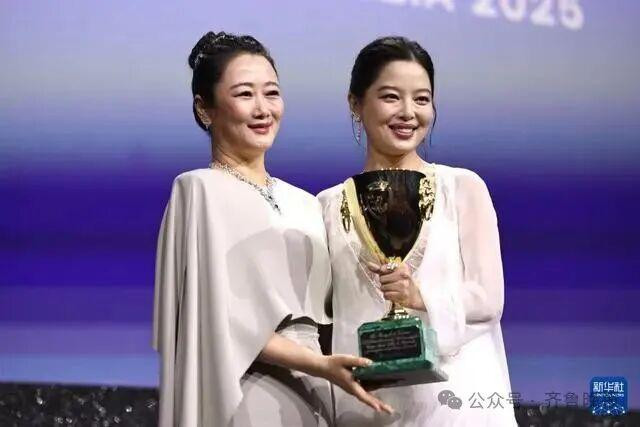9月6日,在意大利威尼斯,辛芷蕾夺得第82届威尼斯电影节最佳女演员奖。这是主竞赛单元评委赵涛(左)为辛芷蕾颁奖。新华社记者李京摄