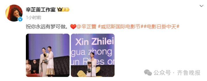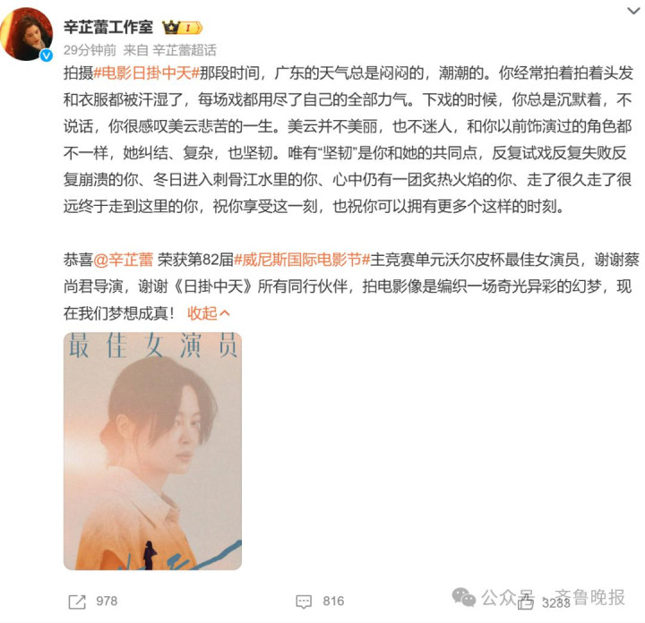 恭喜辛芷蕾荣获第82届威尼斯国际电影节主竞赛单元沃尔皮杯最佳女演员,谢谢蔡尚君导演,谢谢《日掛中天》所有同行伙伴,拍电影像是编织一场奇光异彩的幻梦,现在我们梦想成真!