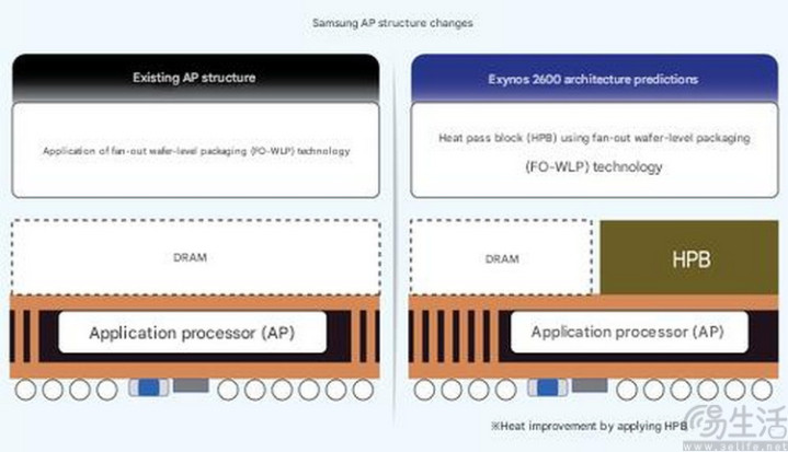 此外有消息称,三星已经在他们自研的Exynos 2600上运用了另一种芯片级的导热方案。其通过半导体制造工艺,直接在SoC顶部、没有被内存芯片覆盖的区域,“耦合”了一层与内存芯片同高度的铜质导热结构,并称之为“HPB(Heat Path Block,导热块)”。