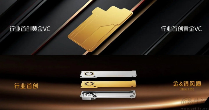 接下来就是均热板的面积越做越大,内部毛细结构愈发复杂,材质也从纯铜进化到了铜+不锈钢的复合设计,甚至还有厂商在上面镀上真金白银,号称可以进一步提高热导率。